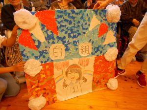 職員が書いた下絵に、ご利用者がコツコツと色の紙を貼って完成した🚩応援ポスター🚩